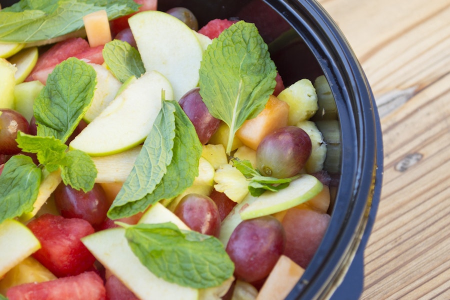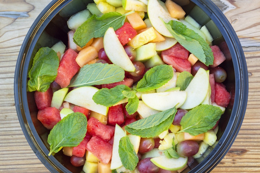 Watermelon, honeydew, cantaloupe, pineapples, apples, red grapes, and mint