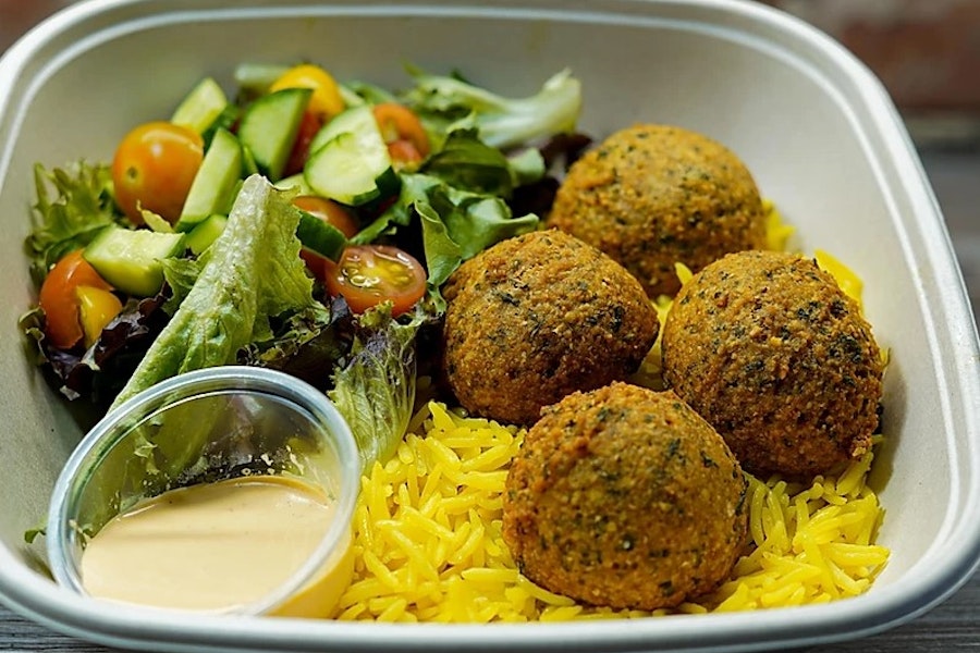 House made falafels, rice, house salad (spring mix, cherry tomato, persian cucumber)