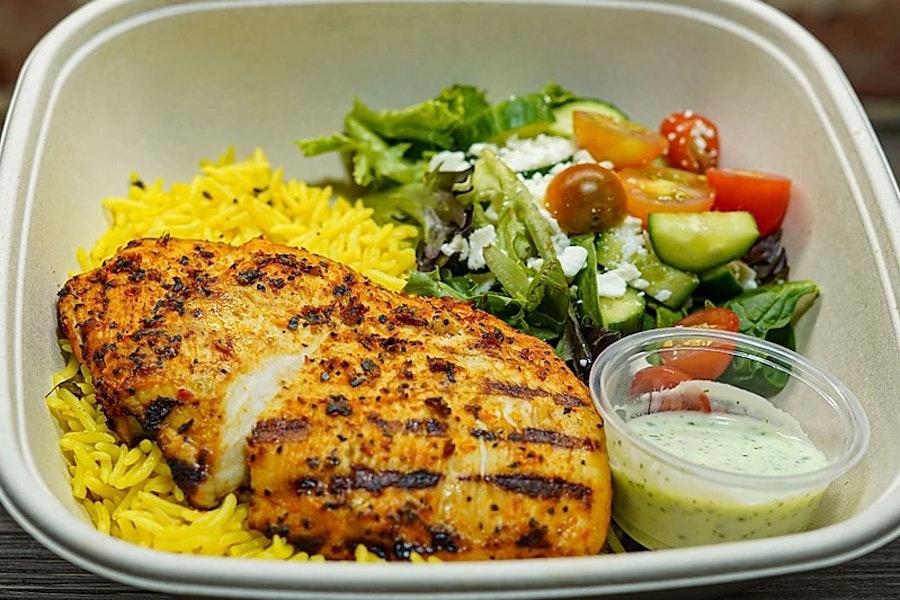 House marinated chicken breast with healthy herbs & spices, rice, house salad (spring mix, cherry tomato, persian cucumber)