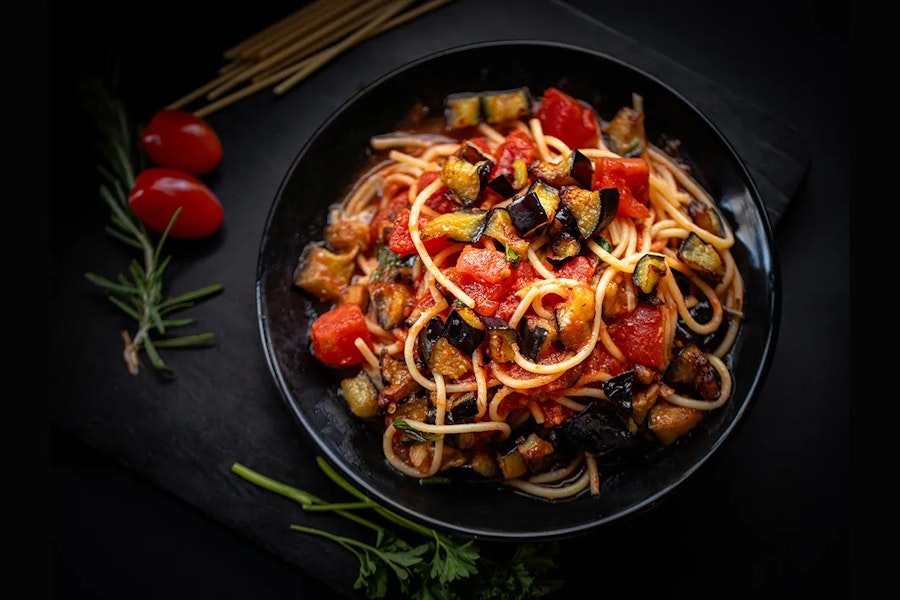 Spaghetti, eggplant, onions, tomatoes in a tomato sauce