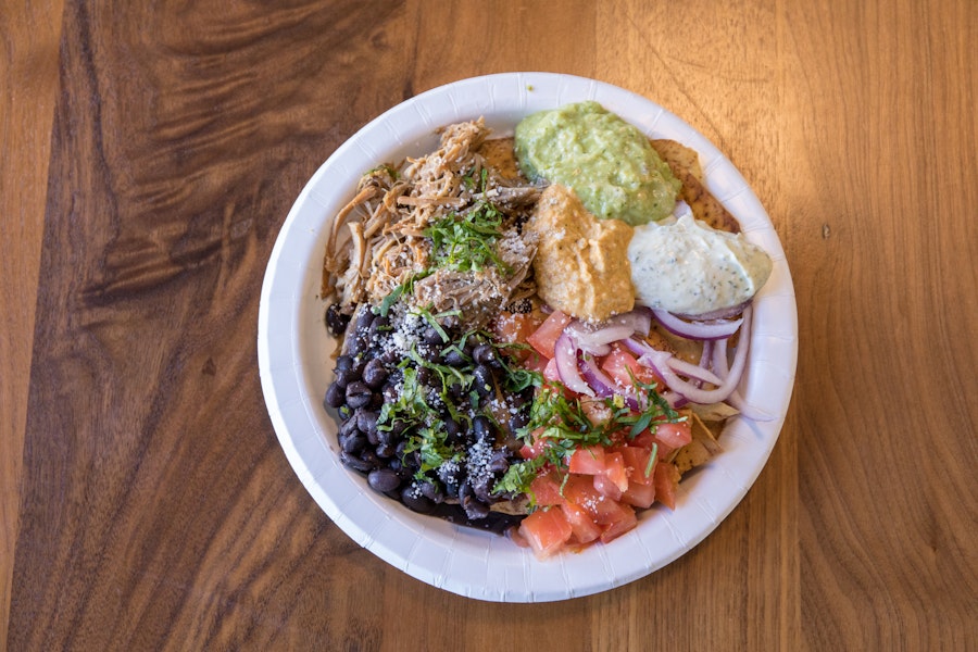 Everything you need to build your own nachos, including your choice of protein, black beans, queso fresco, diced tomatoes, diced red onions, cilantro, aioli, guasacaca sauce (avocado sauce), pica'pun sauce, and taro chips