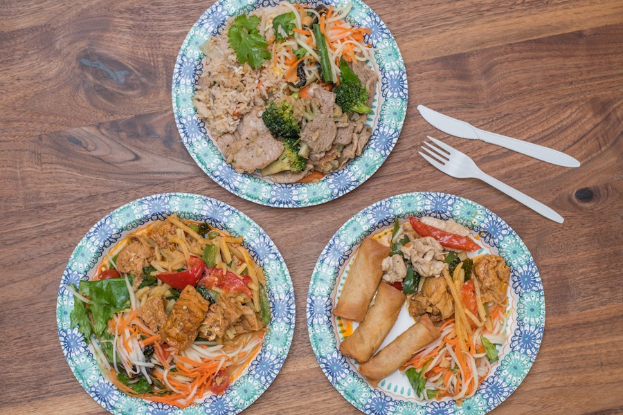 Stir-fried rice noodles with your choice of protein, eggs, bean sprouts, scallions, and ground peanuts