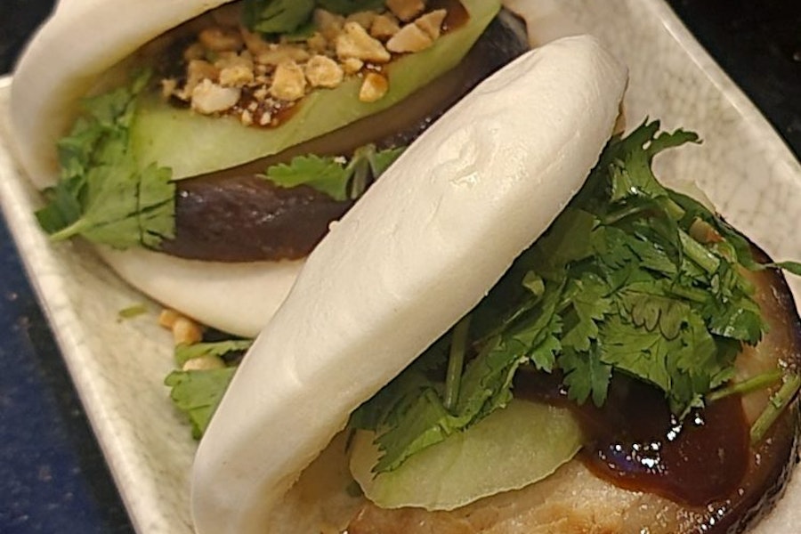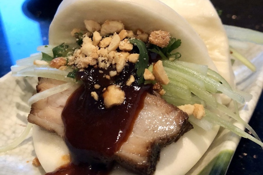 Taiwanese buns with cilantro, crushed peanuts, cucumber & pork belly with hoisin sauce