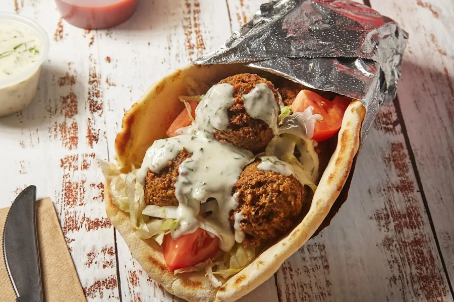 Falafel served with pita, lettuce, cucumber and cherry tomatoes