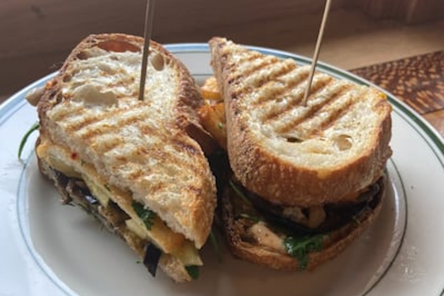 Roasted eggplant, shredded carrots, cucumber tomato, hummus, harissa aioli, arugula, pickled onion on gluten-free bread