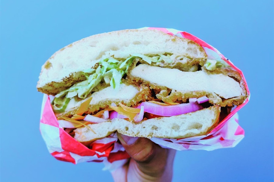 Crispy fried chicken tenders, slow-roasted caramelized pastrami, banana peppers, pickles, mayo & mustard on a toasted brioche bun