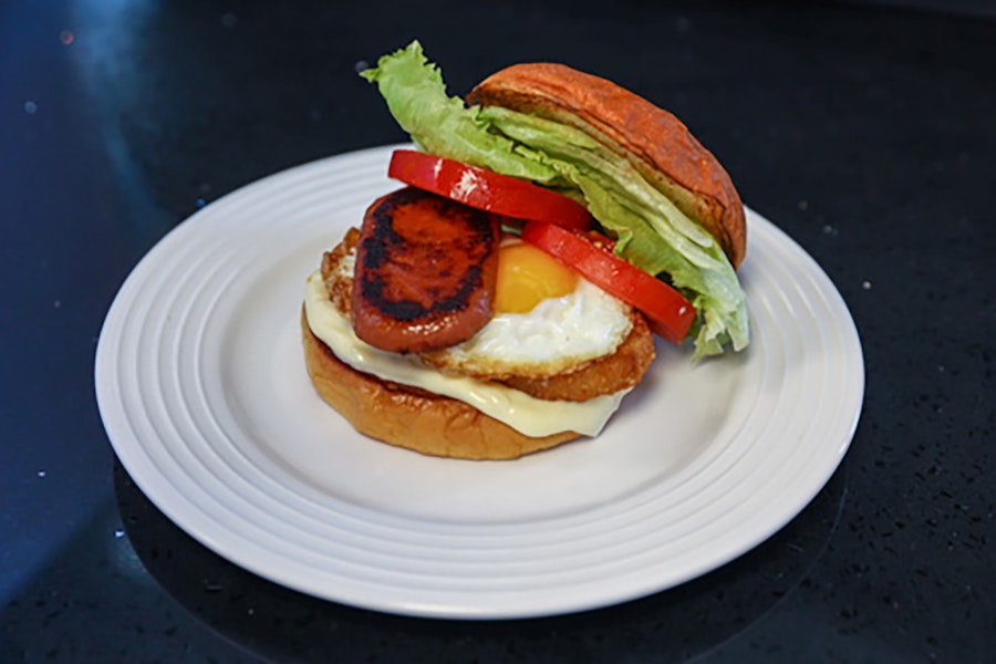 Egg, cheddar cheese, choice of protein, lettuce, tomato, kewpie mayo, hash brown (inside sandwich) and king’s bun