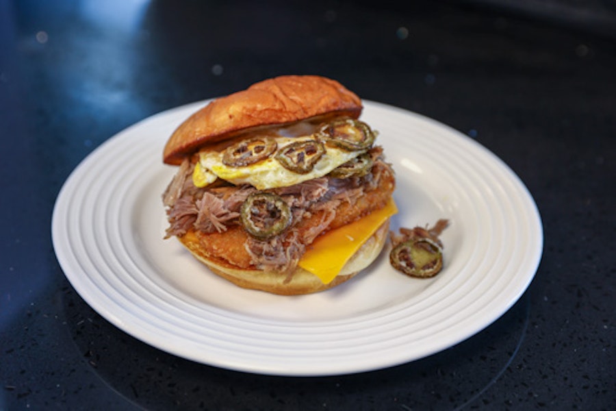 Egg, cheddar cheese, kalua pork, fried jalapeño, hash brown (inside sandwich), hoisin-infused pork jus and king’s bun