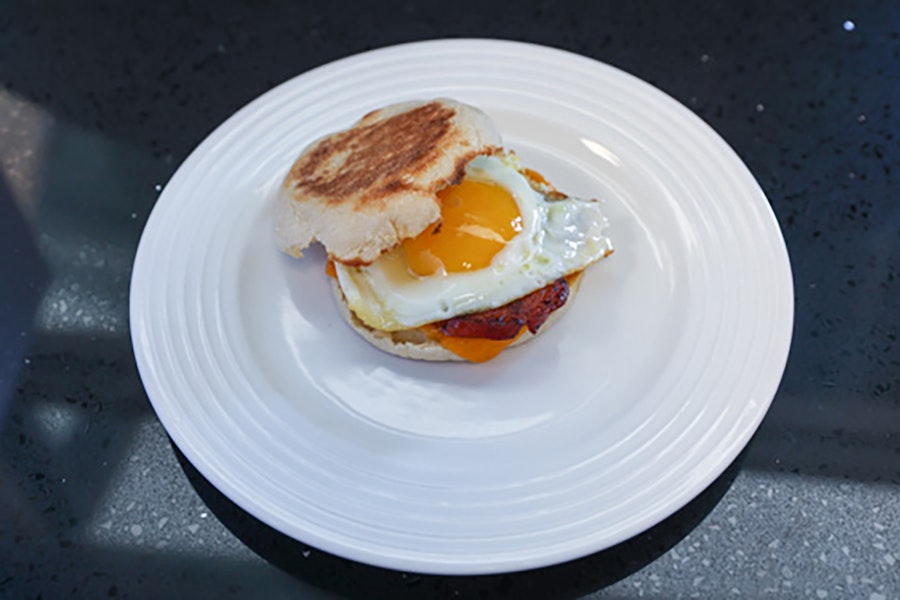 Egg, cheddar cheese, marinated spam on udi's gluten & dairy-free bun