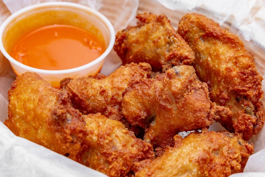 Juicy bone-in chicken wings cooked to order. Served plain with bbq and sriracha buffalo sauce on the side