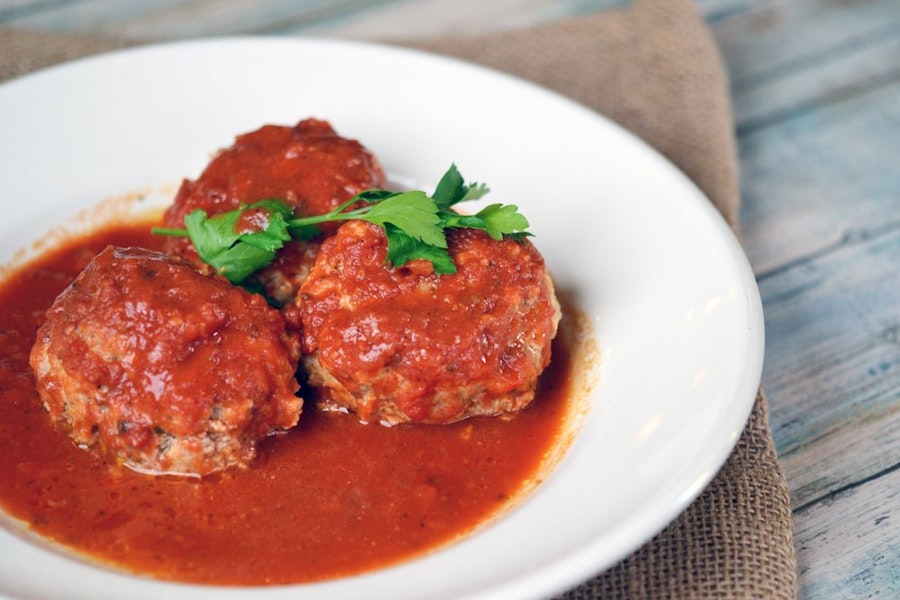 Homemade rice balls with peas, parmesan cheese, marinara sauce
