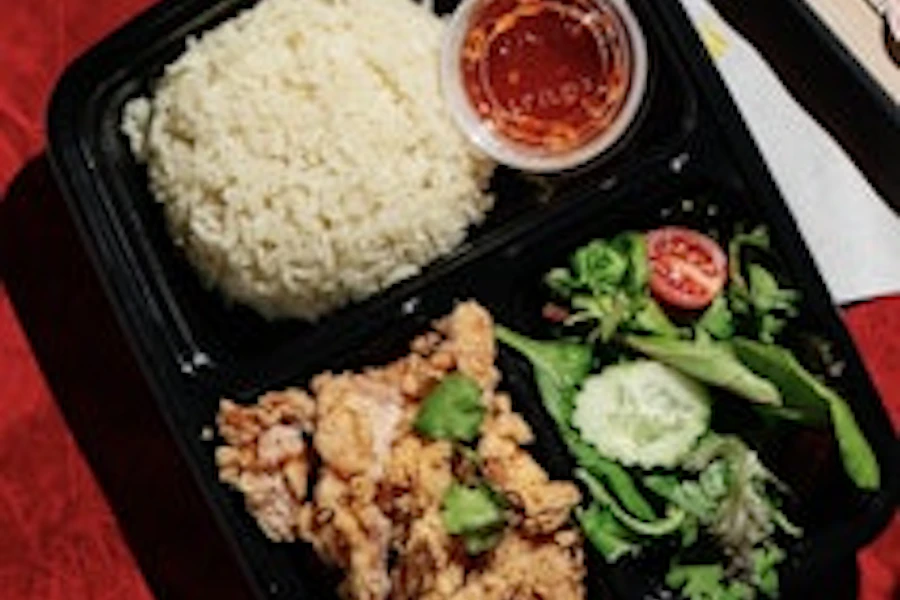 Steam ginger rice, daikon radish soup, house salad: lettuce, mixed green leaf, cherry tomato, cucumber including sweet chile sauce