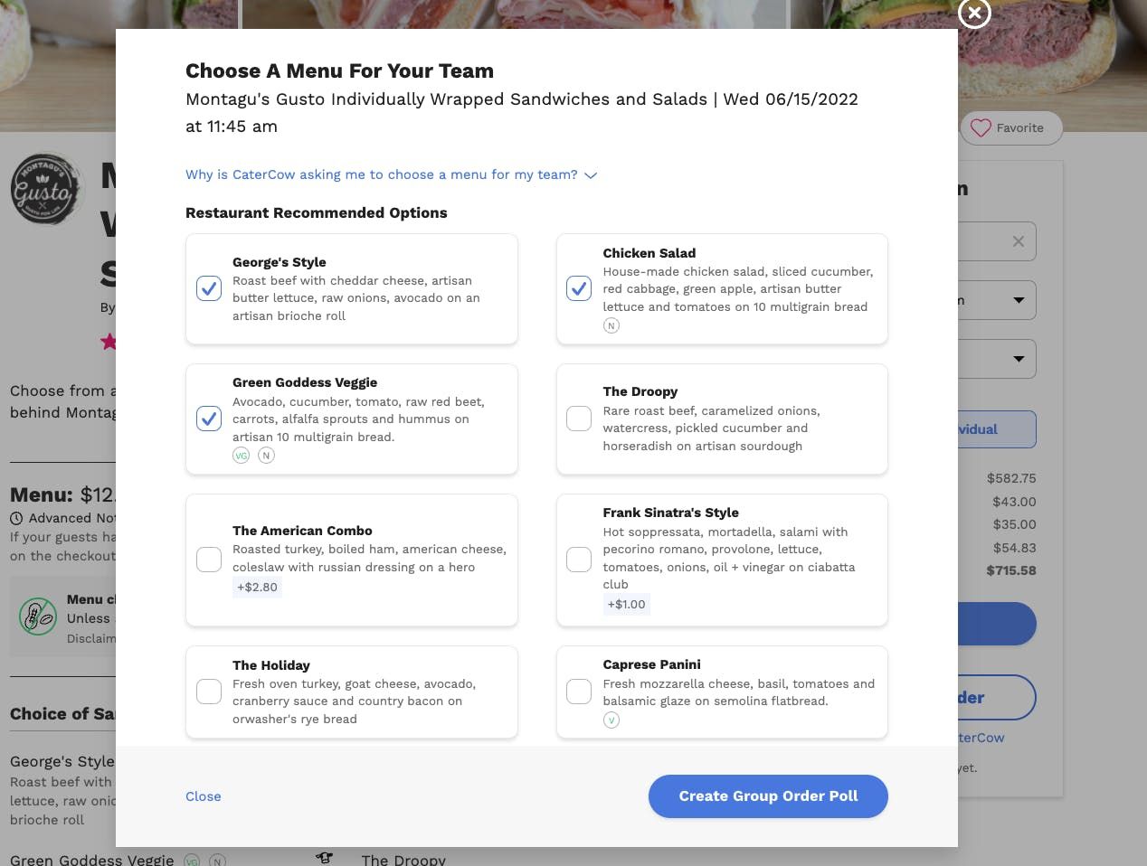 3. From the pop-out you'll be able to pick the options that you want your team to choose from. You know your team best in terms of if you want to give them more vegetarian options, no pork options, etc. Keep in mind, some menus will limit how many options you can choose (ie. 5 max types of sandwiches). If a menu limits your choices, once you click the max number of options, the rest will be grayed out.