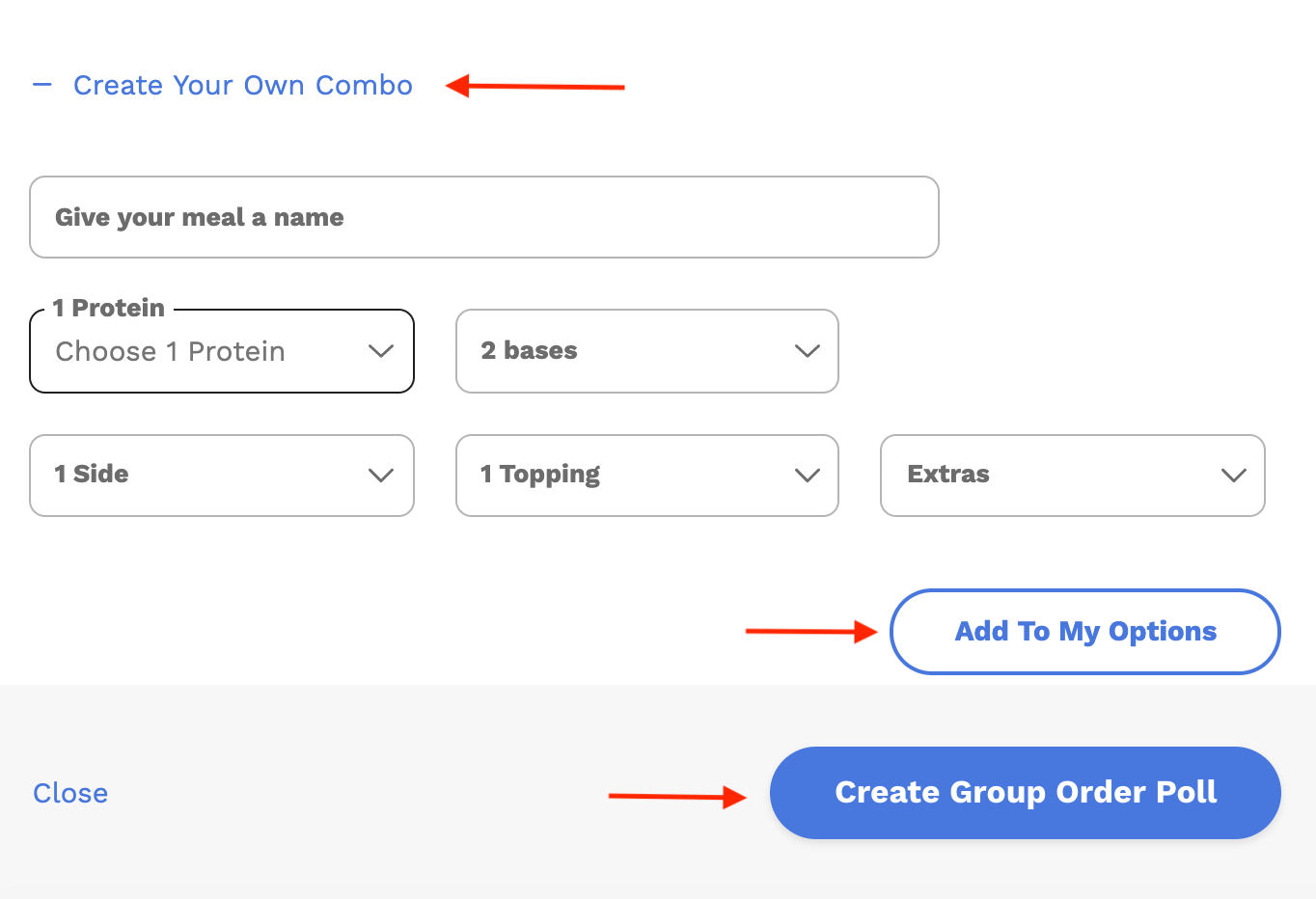 4. If you don't like the options listed out, certain menus allow you to create your own choices. If you want to customize the different parts of the meal, you'll scroll down to the bottom of the list where you'll find a "Create Your Own Combo" button. Click that button to open up the options you can customize. You'll create the item(s) and then click "add to my options" so that you can now select that choice for your team. Once you are done making custom combos, you can then click the blue "Create Group Order Poll" button
