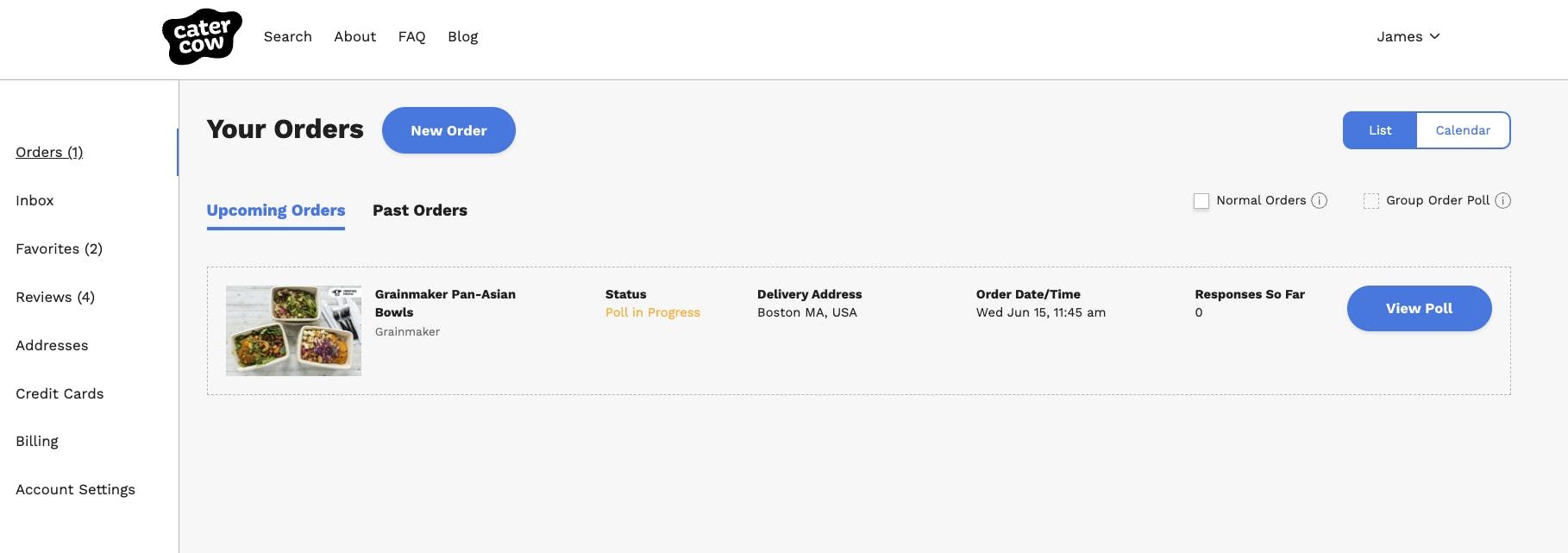 8. Now that you have a poll or two created, you might be wondering where to access them from your CaterCow account? Navigate to your "Orders Page" by hovering over your name in the top right corner of the page and clicking "Orders" from the dropdown. You'll see caterer confirmed orders with solid gray outlines, and prospective group poll orders (waiting to be submitted to the caterer) with a dotted outline. Click the the blue "View Poll" button to get to your specific polls page, where you can track all the responses to your poll, and see and do the items listed in step 7 above