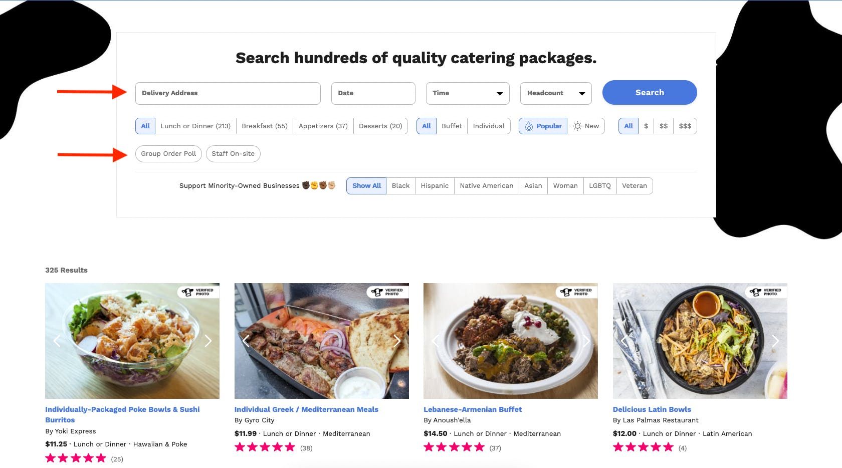 1. First, if you aren't already there, navigate to the CaterCow search page here (if you've already chosen a menu, skip to step 2!). You'll then enter your delivery address, date, time, and expected headcount (your options will update in real-time). Then you'll click the "Group Order Poll" filter button to find all the menus that are eligible for group ordering.