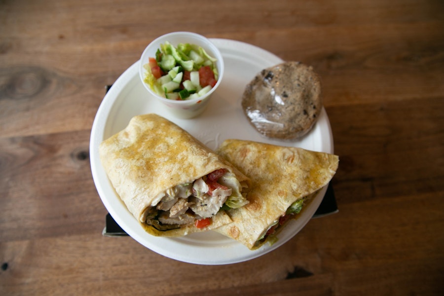 Scratch-made hummus, alfalfa sprouts, cucumbers, lettuce, tomatoes, onion, avocado, and jalapeño in a wheat wrap