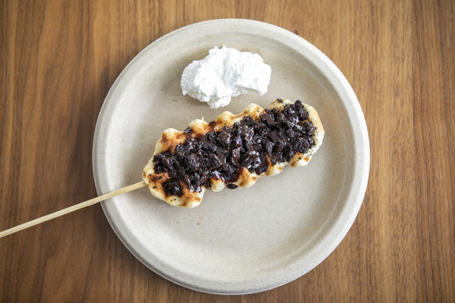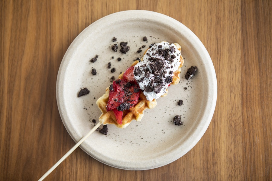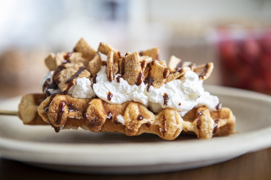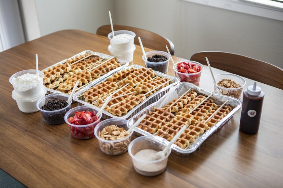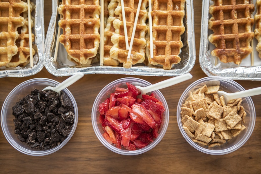 What's a waffle stick pop, you ask? It's a liege waffle baked with pearl sugar, served warm alongside a full toppings bar so you can drizzle and sprinkle to your heart's content! It's a fun and deliciously sweet treat for your office event.