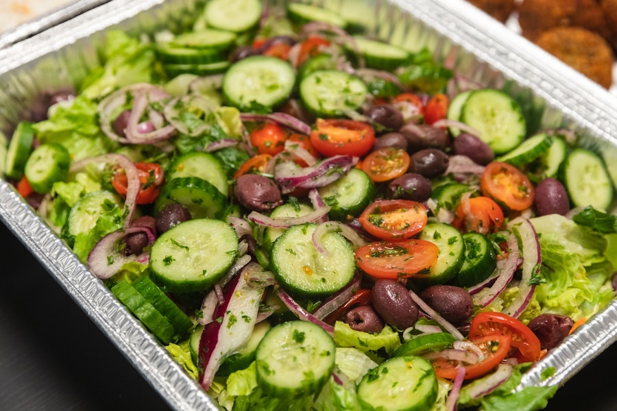 Cucumbers, tomatoes, red onions, parsley, kalamata olives, mizithra cheese and lemon oregano vinaigrette