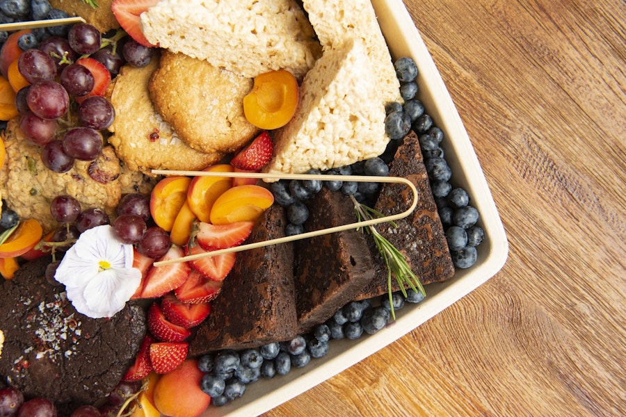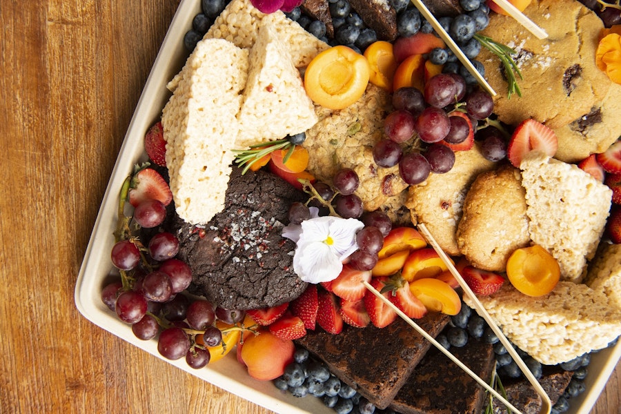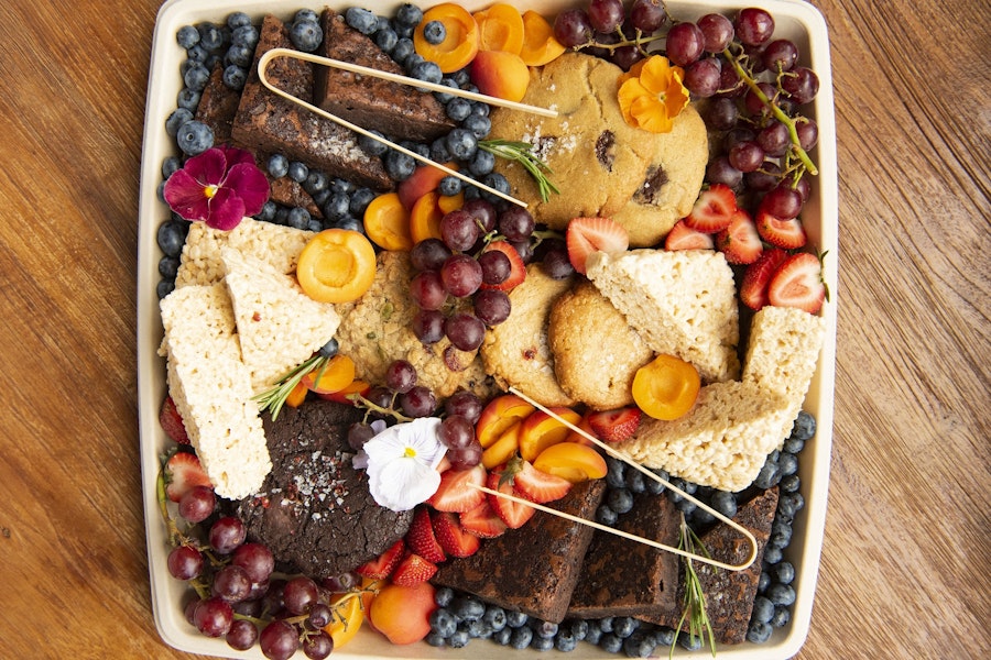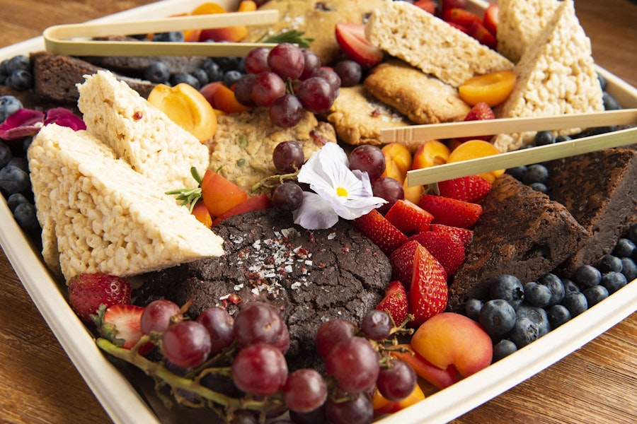 Our baker’s selection of dark chocolate brownies, brown butter rice crispy treats, fresh baked cookies, mini cheesecake bites, and berries