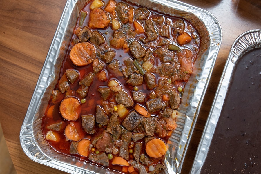 Slow-cooked sirloin cubes with garlic, onions, sweet peppers, tomatoes, and corn