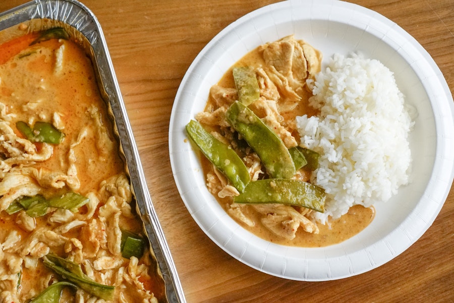 Coconut milk, green beans, lime leaves, and basil, served with rice