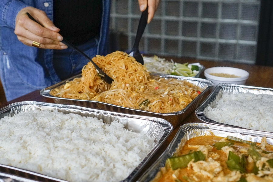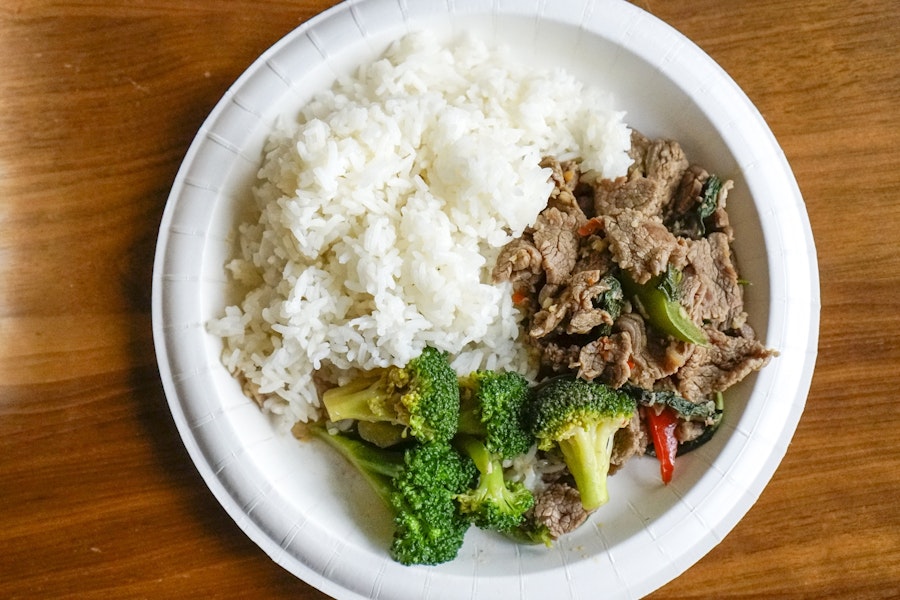 Stir-fried string beans, lime leaves, and chili paste. Served with rice.