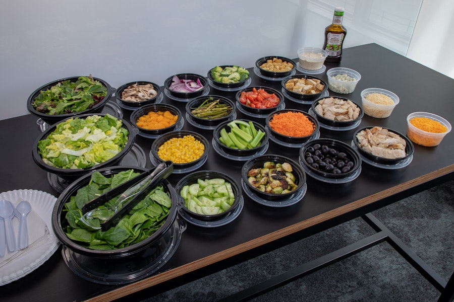 From fresh crunchy vegetables to flavorful cheeses and nutritious proteins, this salad bar includes everything you need for your guests or coworkers to customize their own healthy salads!