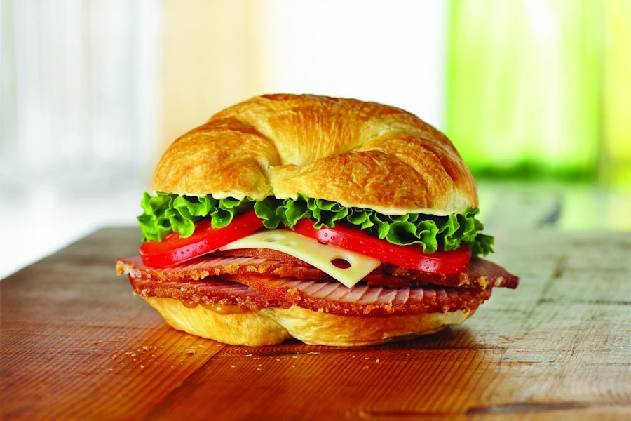 Honey baked ham topped with swiss cheese, lettuce, tomato, hickory honey mustard on a flaky croissant