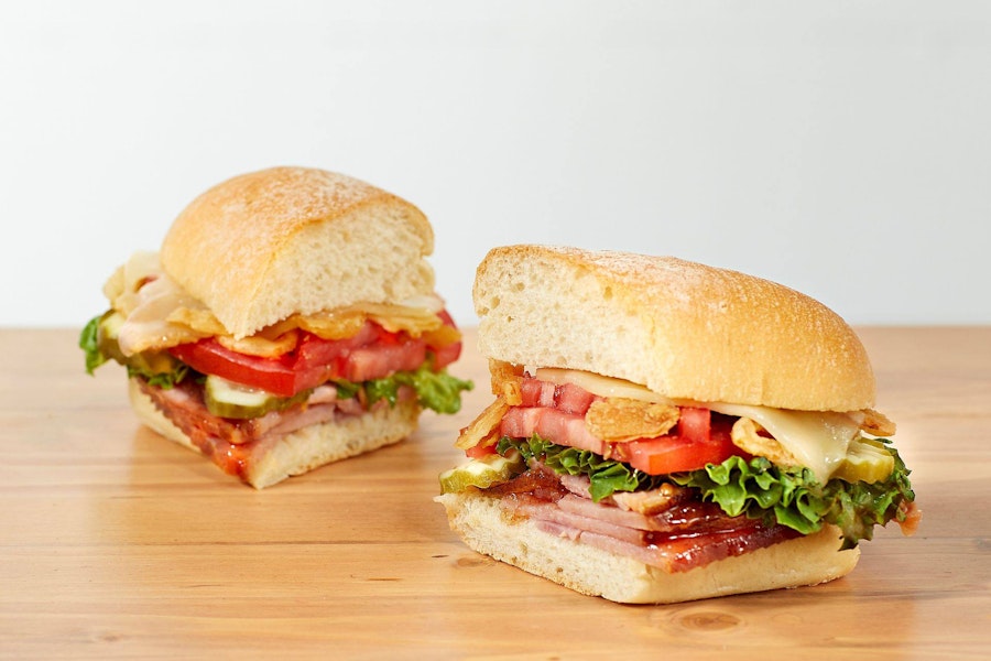 Honey baked ham, bacon, cheddar cheese, lettuce, tomato, red onion, and smoky bbq sauce on ciabatta