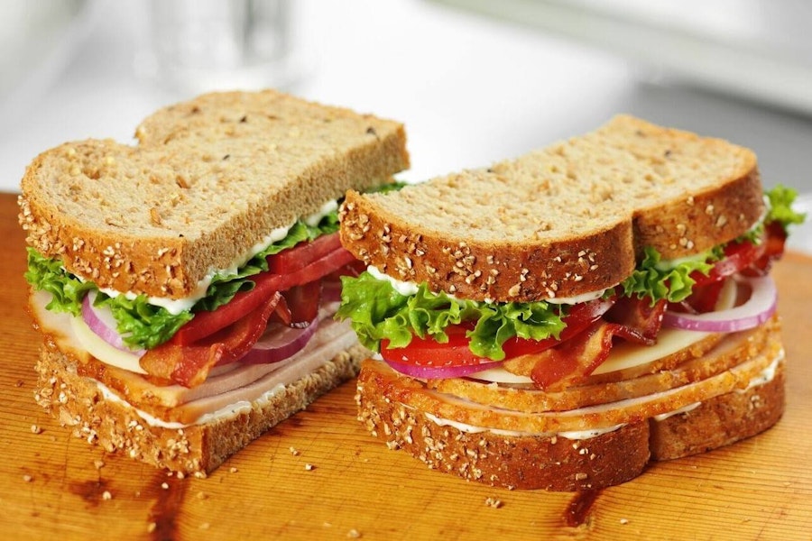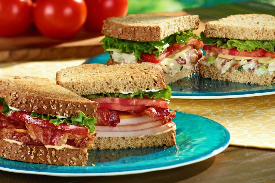 Smoked honey baked turkey breast with bacon, cheddar cheese, lettuce, tomato, red onion, buttermilk ranch on multi-grain bread