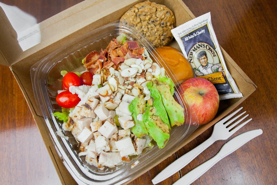 Each box comes with a handcrafted salad, apple, cookie, and a freshly baked roll (roll & cookie are not gluten-free or vegan - please let us know if you need these left out of your box).