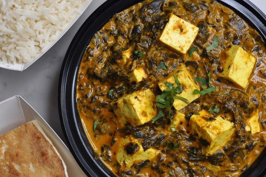 Chopped spinach in a curried paneer sauce