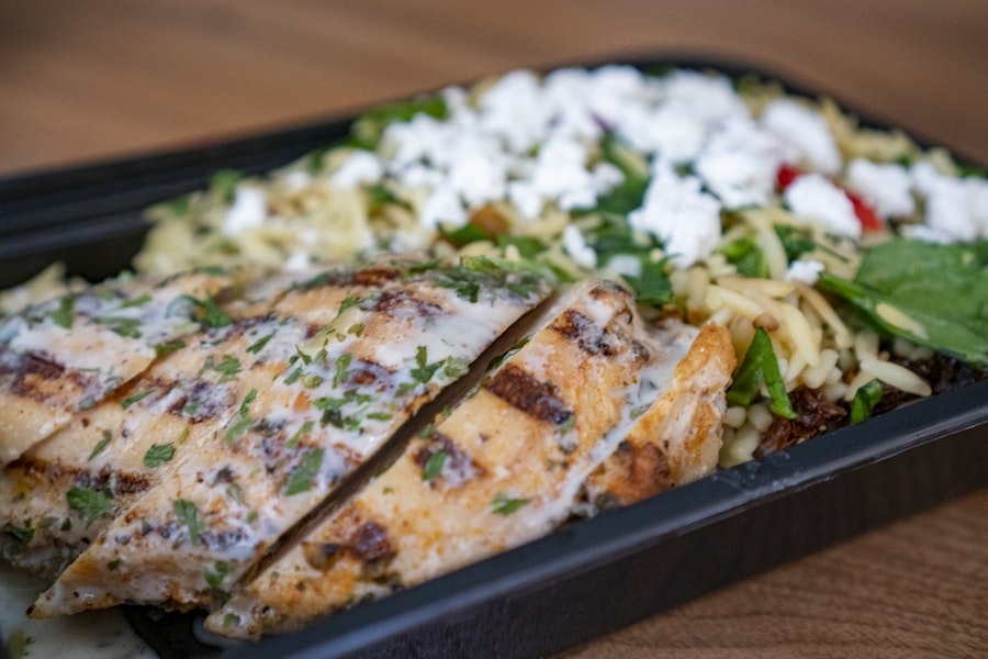 Served with orzo pasta salad with sun-dried tomatoes, baby spinach & red bell peppers, a field green salad (with tomatoes cucumbers, peppers & carrots), balsamic & ranch dressings and rolls