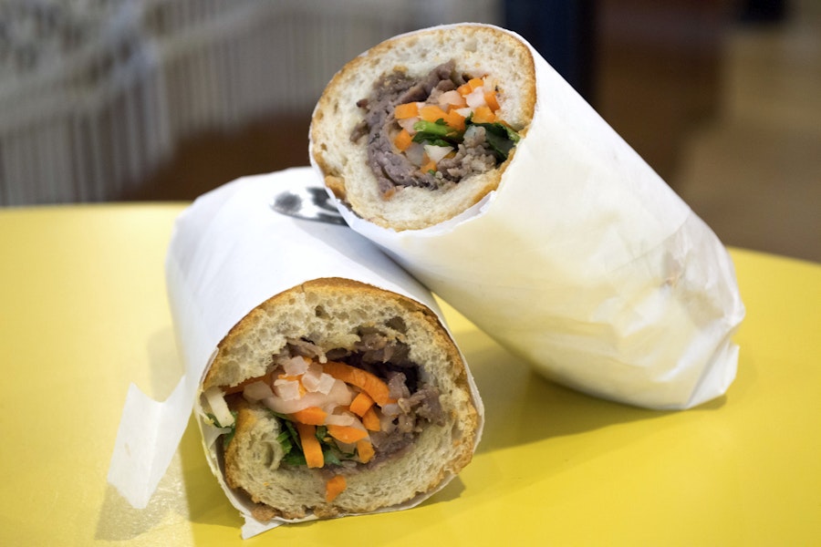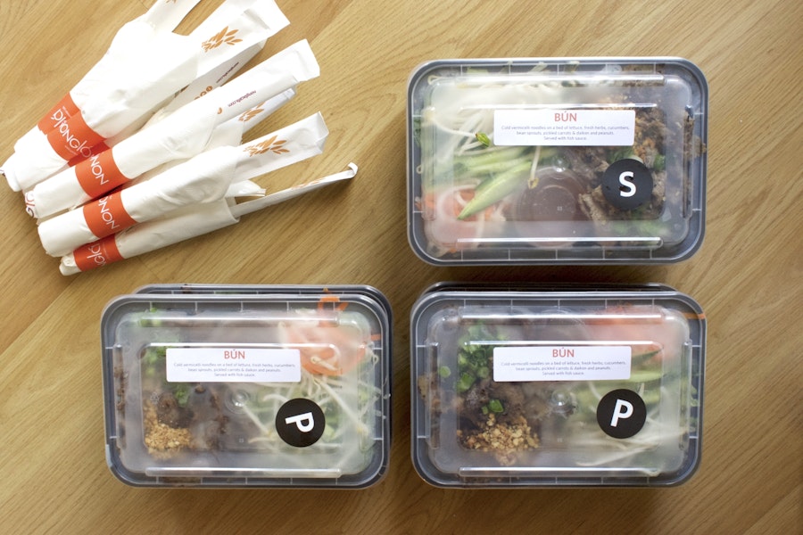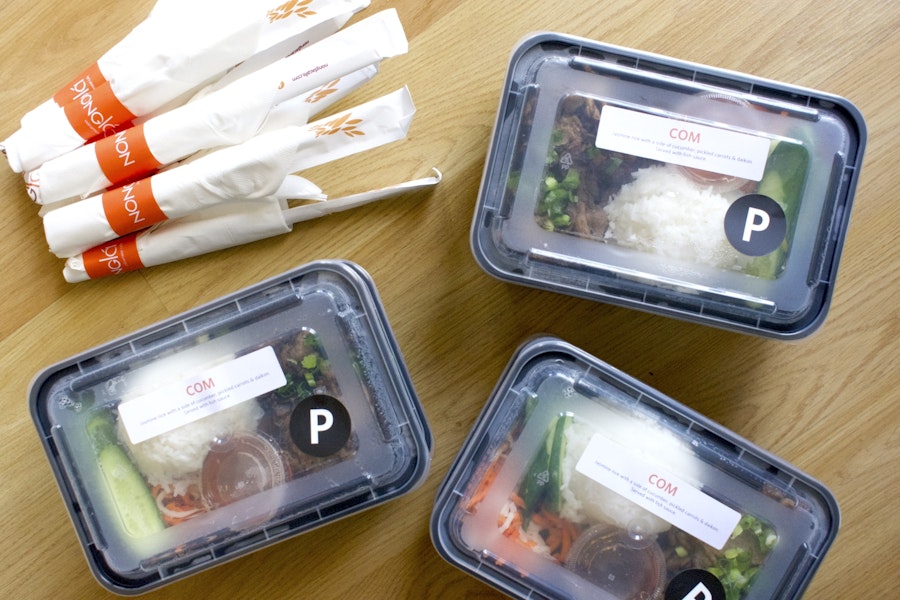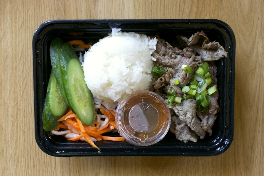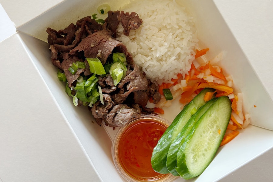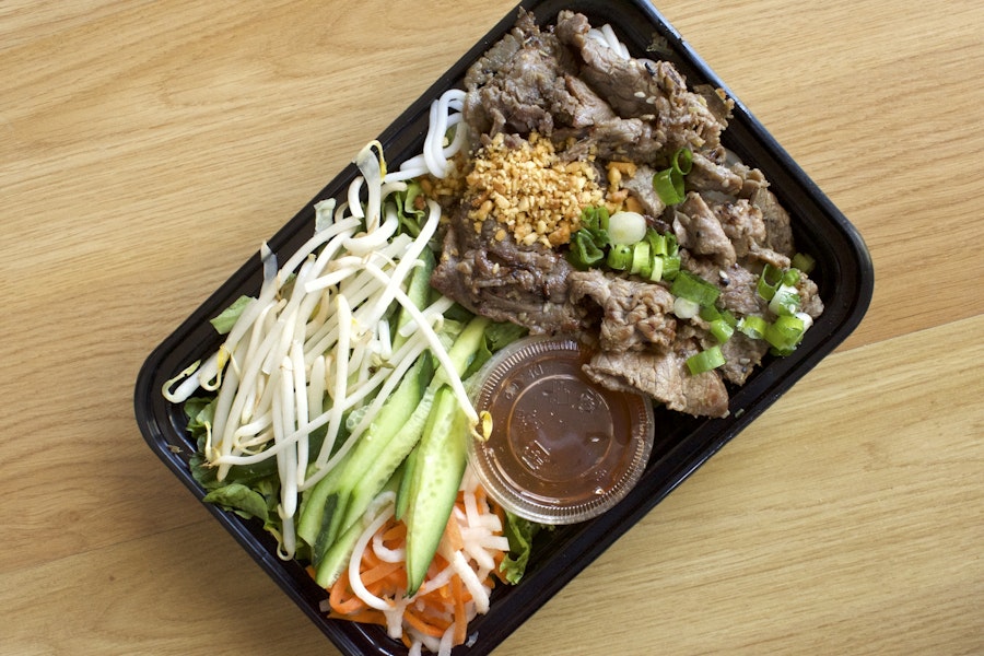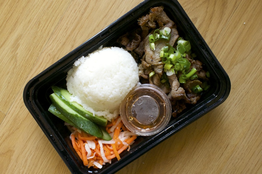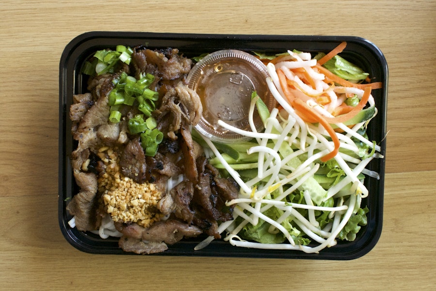 "Bun" (noodle salad) meals come with cold vermicelli noodles served on a bed of lettuce, fresh lettuce and mint, cucumbers, bean sprouts, pickled carrots & daikon and peanuts - served with fish sauce. "Com" meals come with jasmine rice a side of cucumber, pickled carrots & daikon and fish sauce. "Pho" is topped with white & green onions, cilantro & a side of bean sprouts, basil, lime and jalapenos. "Banh Mi" include house mayo, pickled carrots & daikon, cilantro and jalapeños