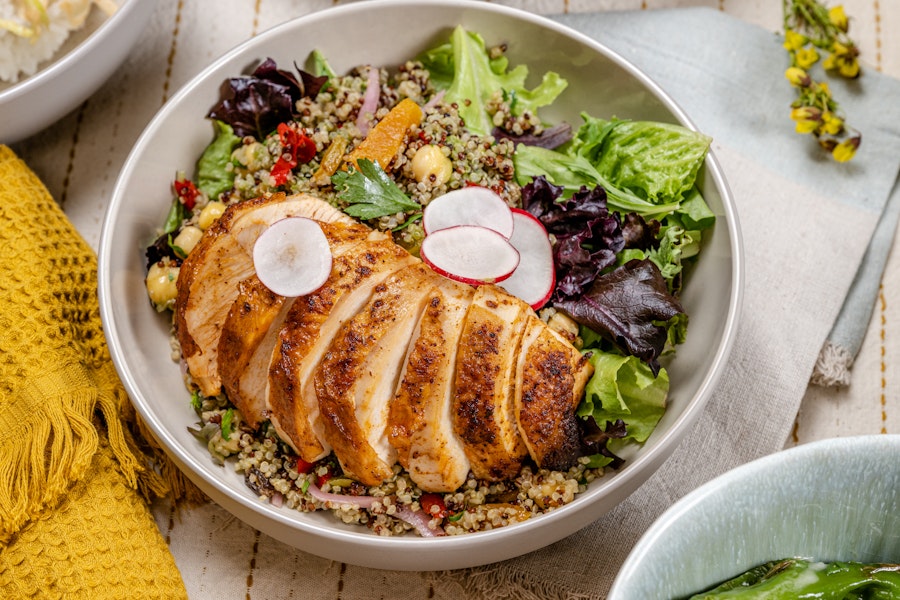 Sliced chicken breast over quinoa with chickpeas, red onions, apricots, peppers, and parsley