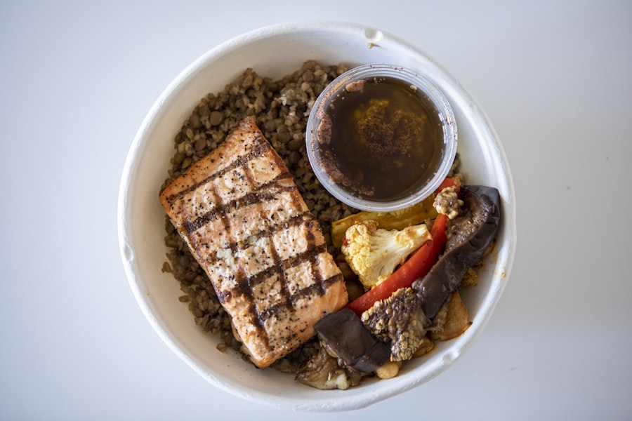 Organic romaine & cabbage, tossed with radishes, tomatoes, carrots, cucumbers, fresh pomegranate seeds, mint, with pita chips and fried shallots served with lentils & bulgar topped with baked salmon