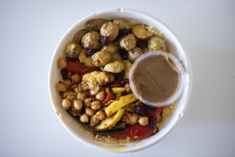 With lamb, lemon couscous, carrot, dried fig slaw, toasted almonds, and harissa yogurt sauce