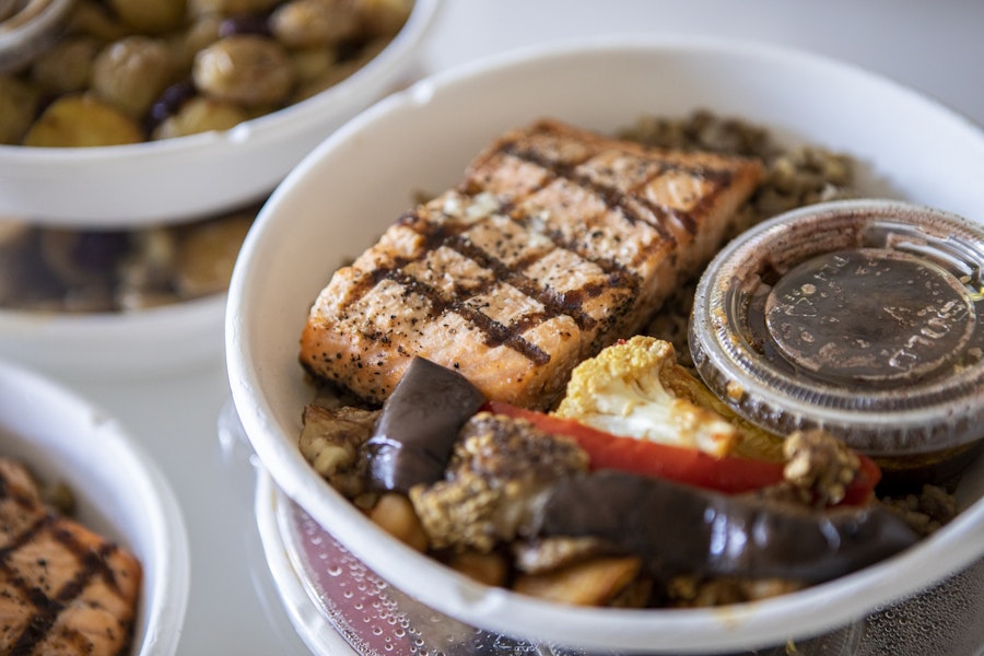 Baked salmon, avocado, cherry tomatoes, cucumbers, shredded carrots, mixed greens, baby kale and romaine with a creamy basil dressing