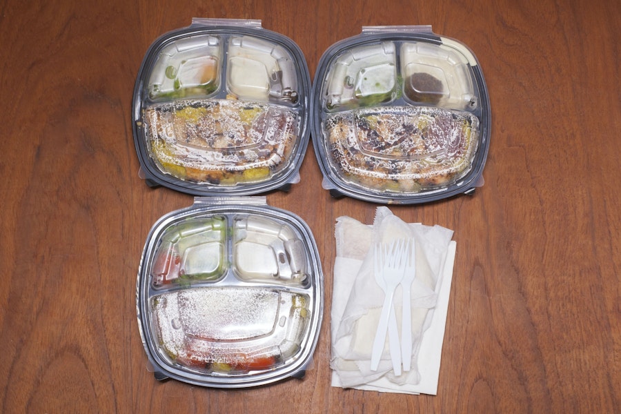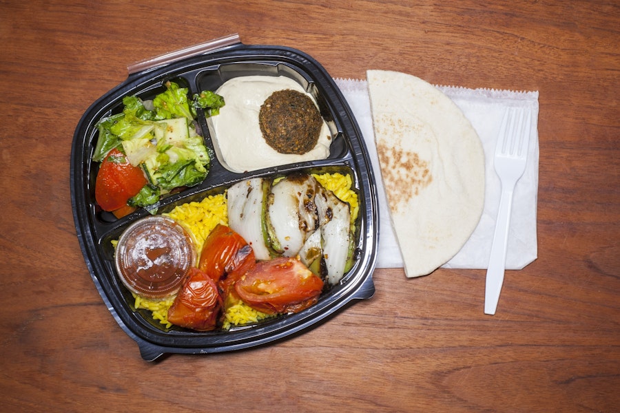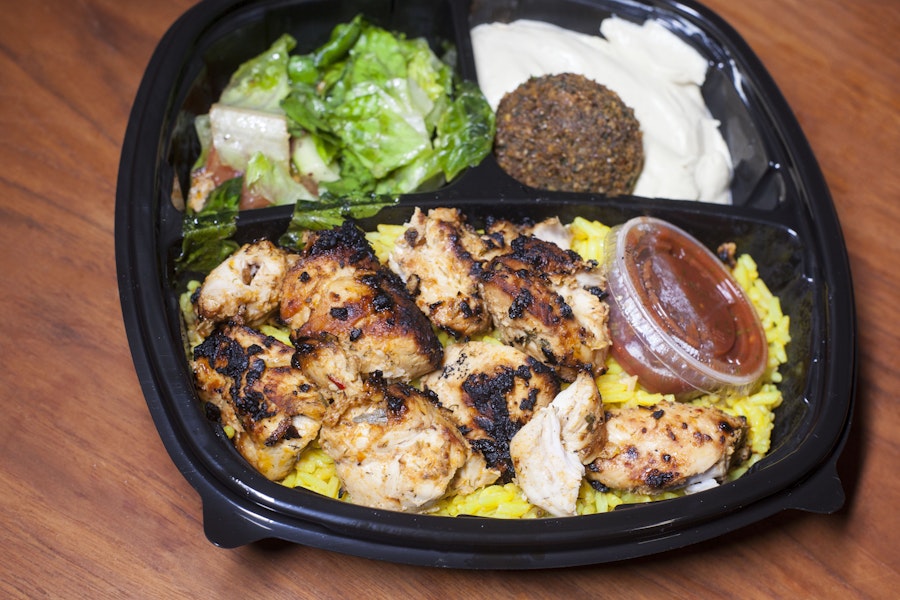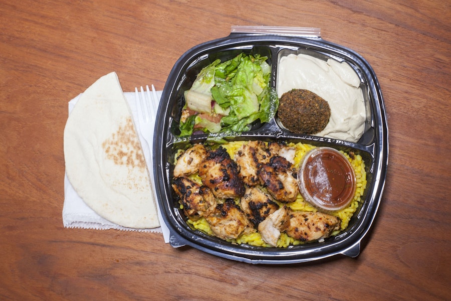 Two skewers of seasonal grilled veggies. Served with rice, hummus salad, pita (pita is not gluten-free),, and sauce on the side