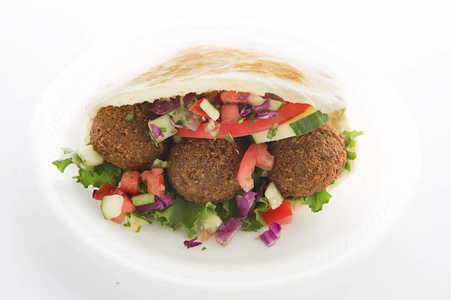 Sandwiches are stuffed with protein, lettuce, tomato, cucumber, parsley.
