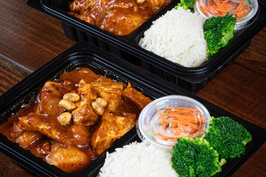 Chicken massaman curry (gluten-free curry paste, spices, coconut milk, onions, peanuts & potatoes), rice, and a cucumber salad
