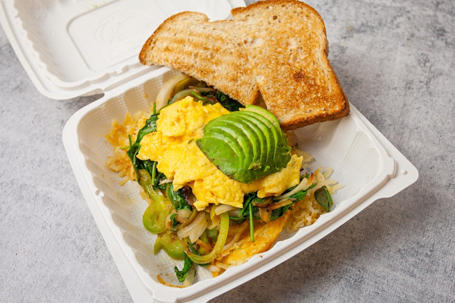 Breakfast potatoes, grilled peppers, onions, spinach, broccoli, avocado, two eggs