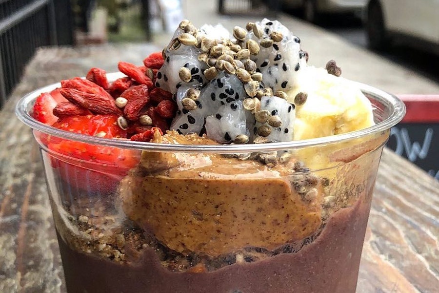 Organic acai, banana, topped with blueberries, gluten-free granola, and almond butter