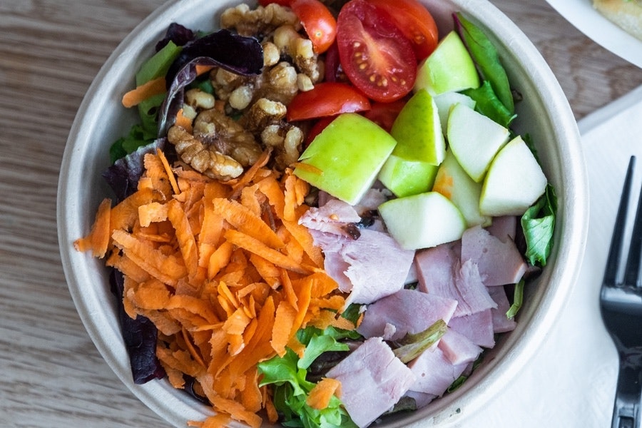 Fresh spring mix, apple, walnut, ham, shredded carrots, tomato, so nice dressing (white balsamic vinegar, olive oil, cumin, salt, pepper)