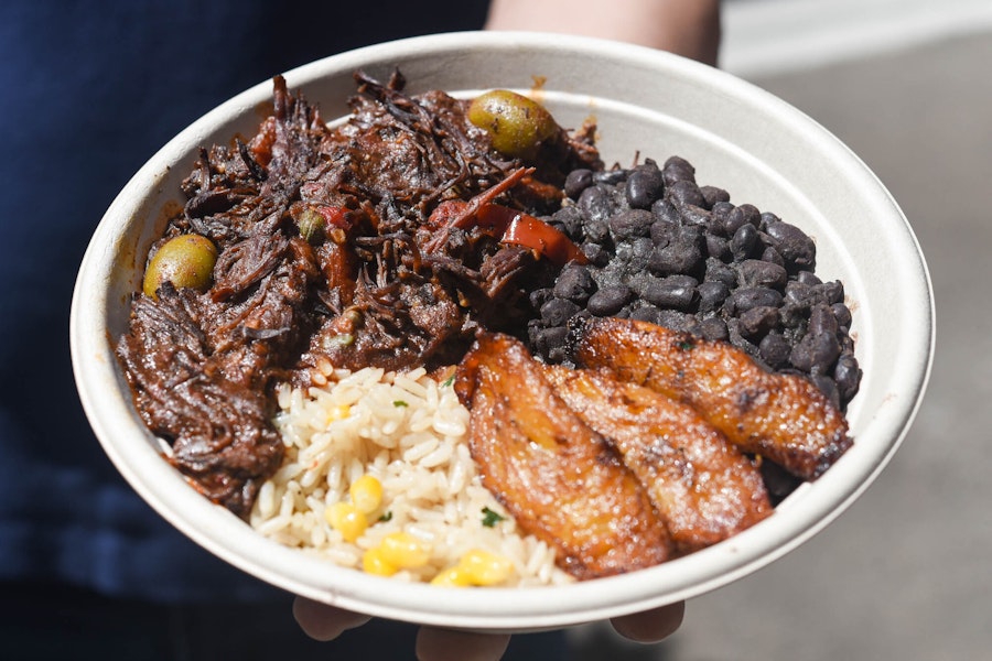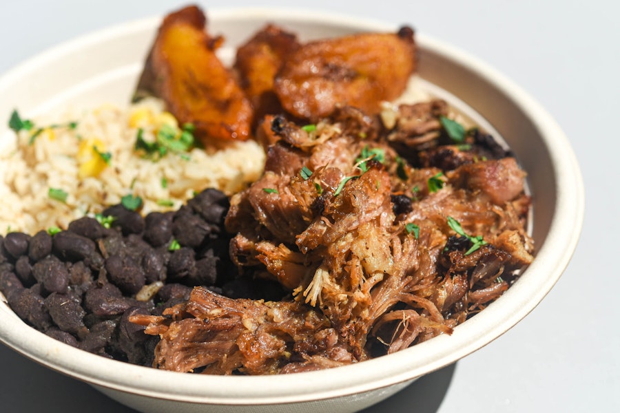 Each bowl includes your choice of protein, Cuban rice with corn, black beans, fried plantains, grilled red onions & charred tomatillo salsa