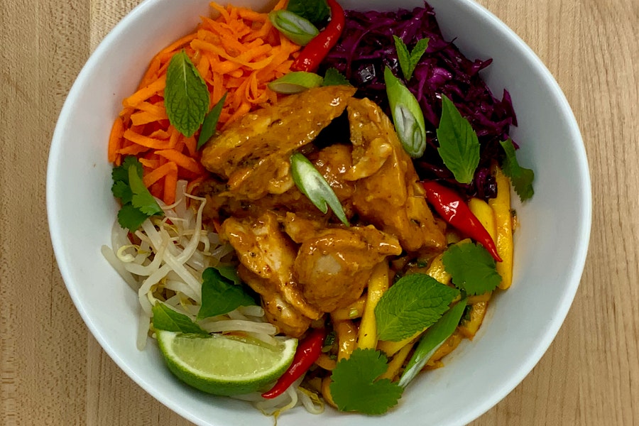 Pickled mango, red cabbage, carrot slaw, bean sprouts, green onion, holy basil, cilantro, mint, chilies, peanut sauce, hot peppers