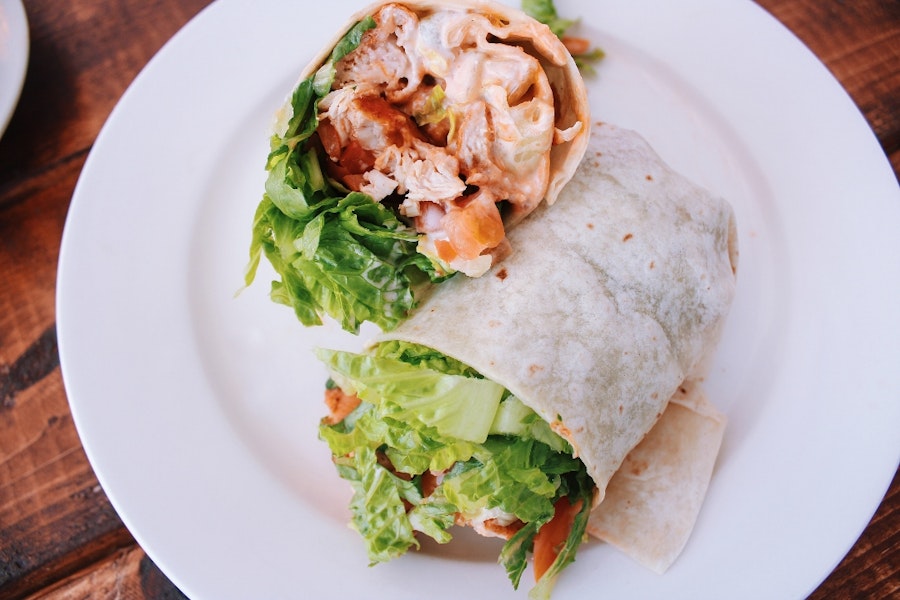 Fried buffalo chicken, lettuce, tomato, and blue cheese all in a tortilla wrap