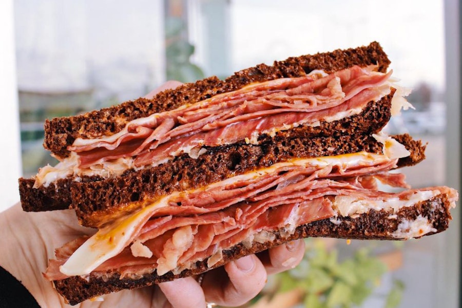 Slices of corned beef, sauerkraut, russian dressing, swiss cheese on dark rye