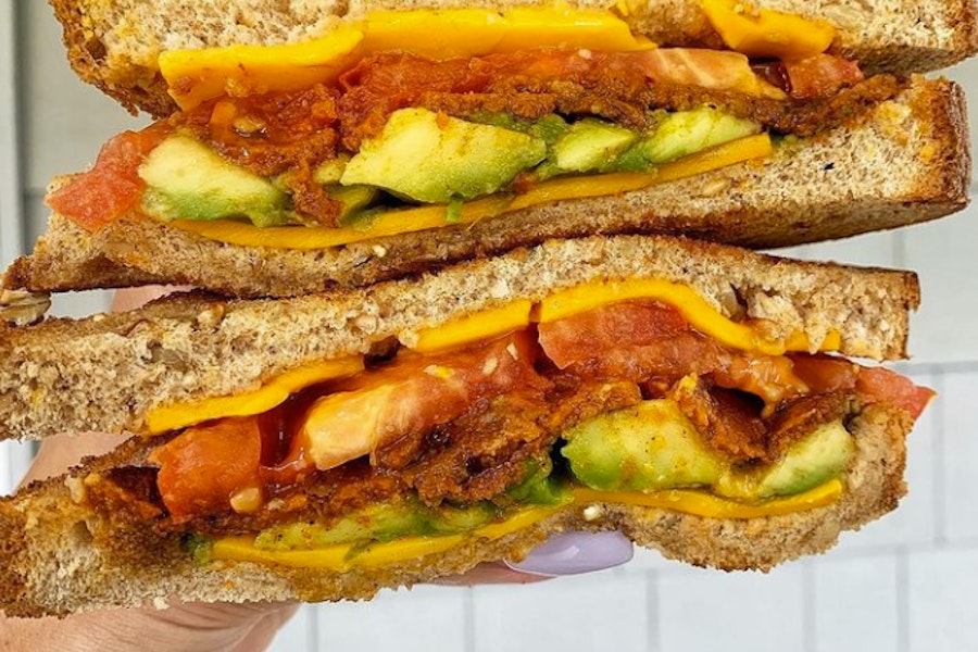 Plant-based bacon, avocado, lettuce, tomatoes on gluten-free bread